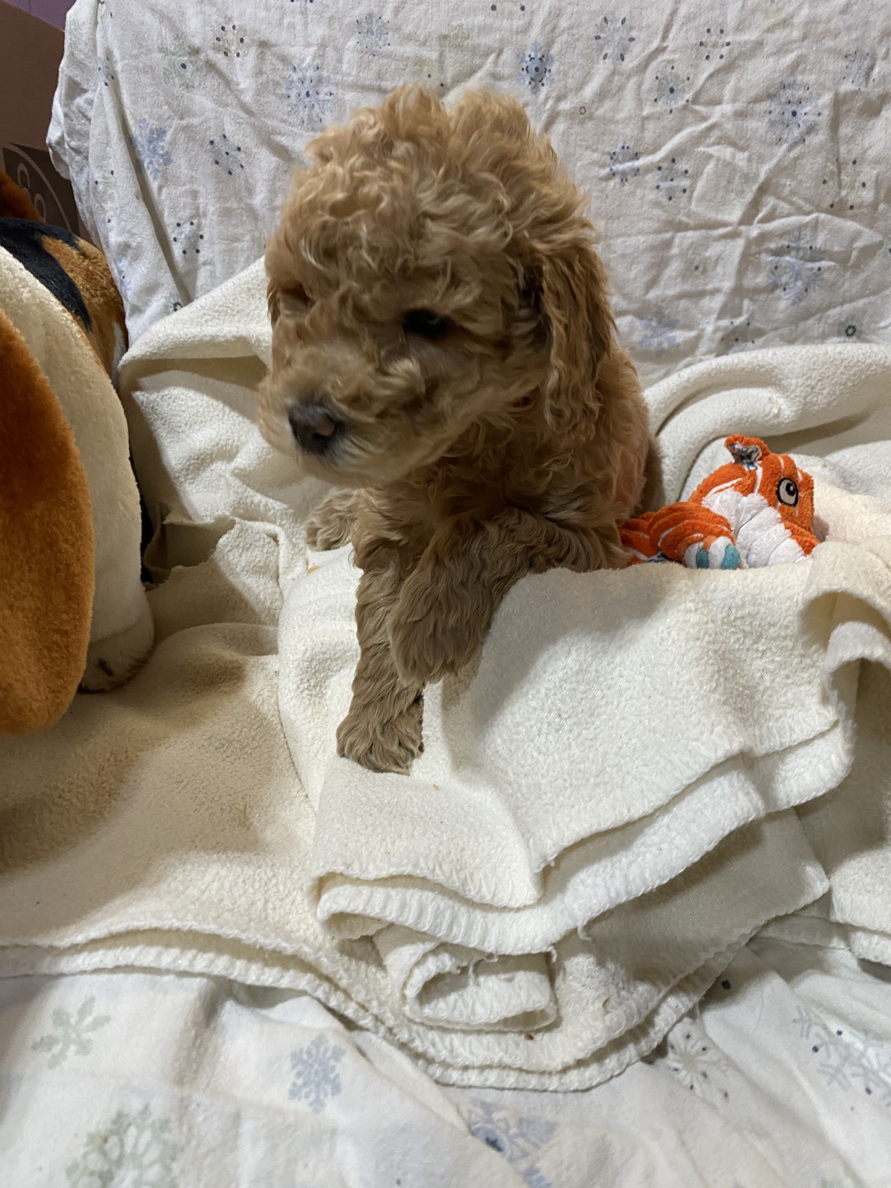 Mr. Orange - or, "Blitzen" as my daughter named them all after reindeer, is a fun loving playful little guy. He should grow to about 25-30 pounds and he is an F1B mini-goldendoodle.